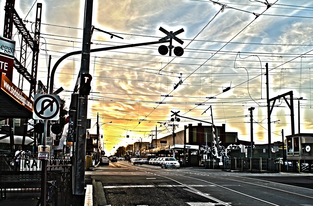 Ich komme aus der City, der Zug hält quietschend im Bahnhof und ich steige aus. Es ist Freitagabend, die Sonne geht langsam unter. Allmählich werden die Schatten länger und der spätsommerliche Abendhimmel erstrahlt in einem goldenen Licht. Für den Zug geht es weiter, immer weiter in Richtung Frankston. Stück für Stück heben sich die Schranken des Bahnübergangs und alles setzt sich wieder in Bewegung.