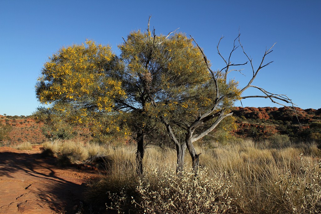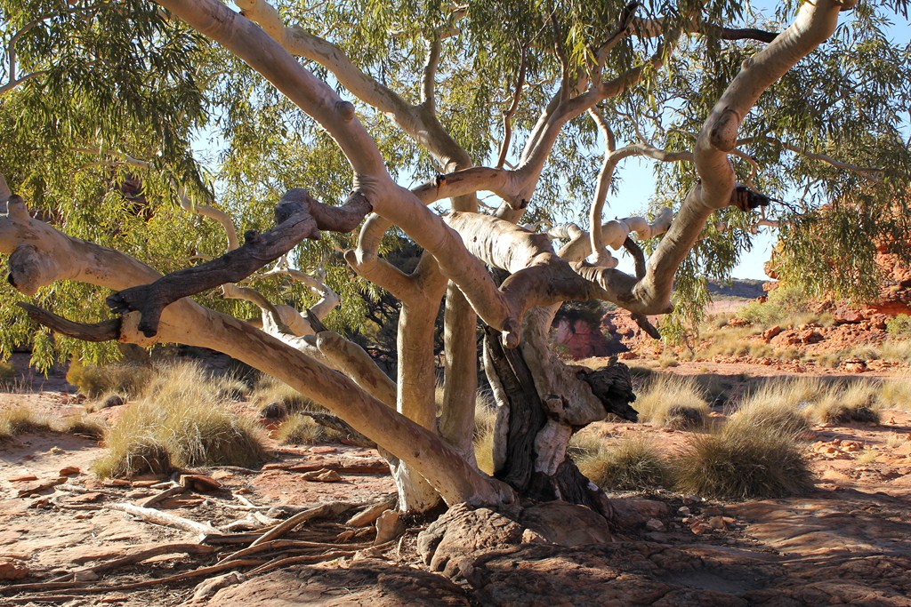 Dieser Eukalyptus dort vorne sieht schick und einladend aus. Als Nachtlager sollte man ihn allerdings besser meiden. Seine Art hat den berüchtigten Beinamen Widow Maker – Witwenmacher. Wenn er Not leidet, zum Beispiel wegen Wassermangels, kann es nämlich vorkommen, dass er sich denkt: “Nööö, diesen Ast da hinten, den kann ich nicht mehr unterhalten. Und eigentlich brauch ich den auch gar nicht. Also weg damit.” Und plumps, fällt das Ding ohne jegliche Vorwarnung vom Stamm.
