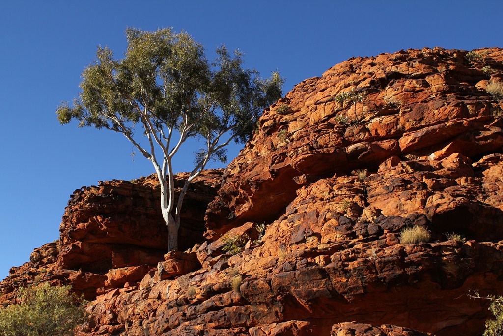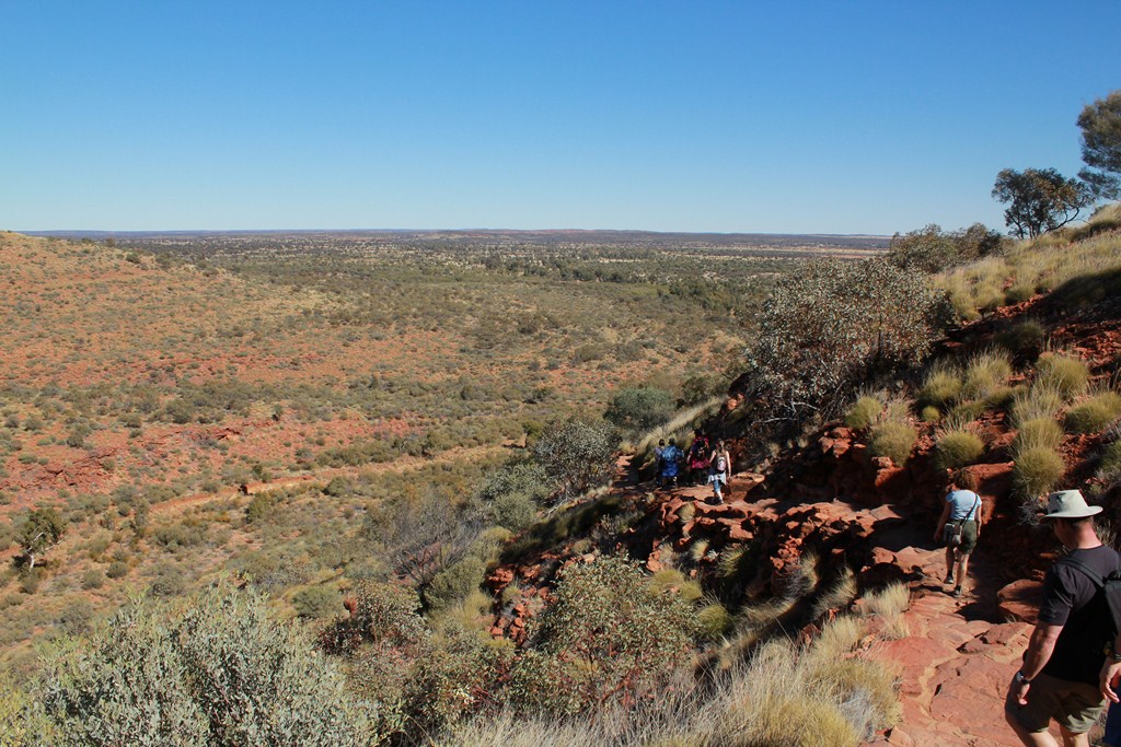 Schon bald passieren wir die Grenze zum Watarrka National Park. Hier wollen wir an diesem klaren Vormittag die größte Attraktion des Nationalparks erwandern: den Kings Canyon. Vor uns liegt ein Weg von mehr als sechs Kilometern, einmal um diese großartige Schlucht herum. Immer an der Kante entlang.