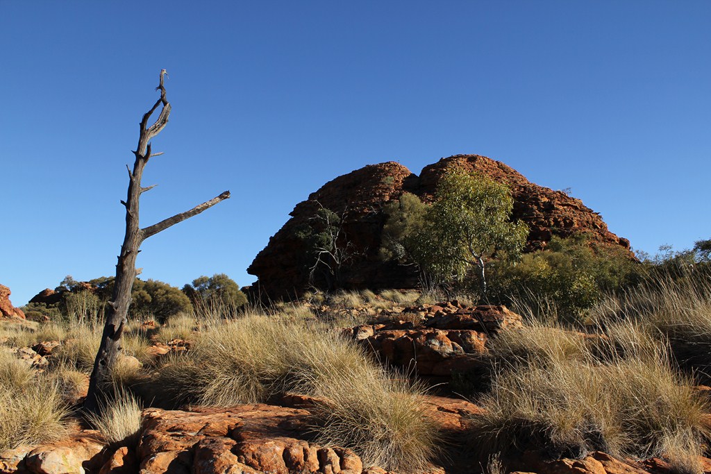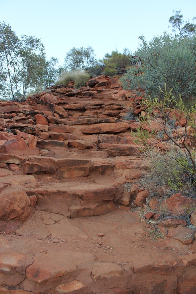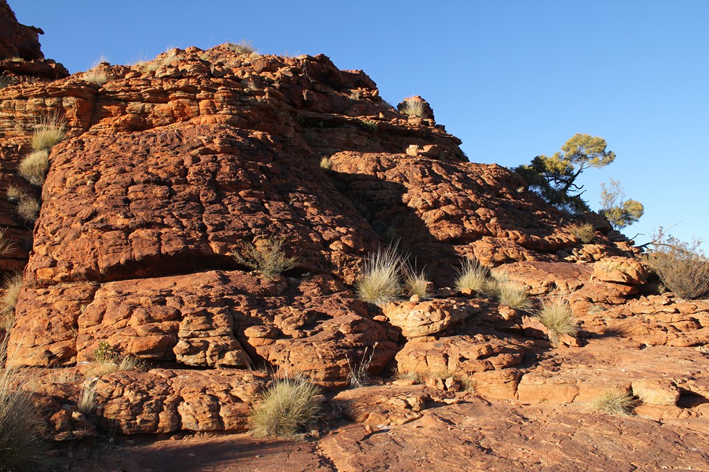 Oben angekommen wird man mit zweierlei Dingen belohnt. Zum einen mit einem kräftig warmen Körper, was bei den momentan herrschenden fünf Grad ganz angenehm ist. Und zum anderen mit einer wunderschönen Landschaft: Bienenwaben-artige, im vertrauten Rot gefärbte Felsen umgeben uns, werden von Vegetationsbändern aus Spinifex-Gräsern und Eukalyptusbäumen durchzogen und vom tiefblauen Outbackhimmel überspannt.