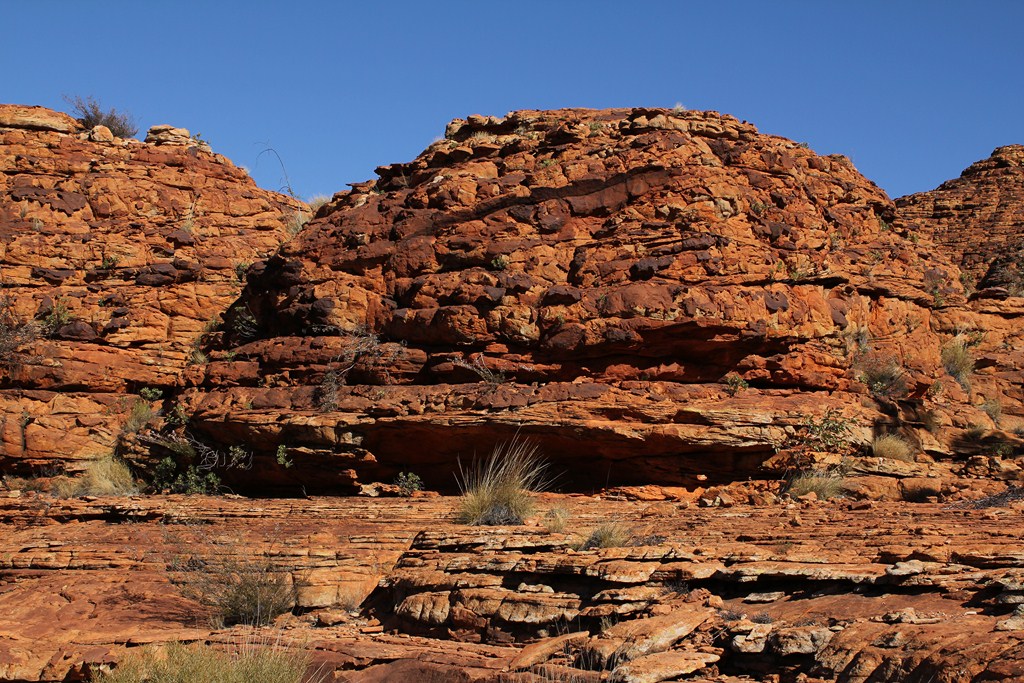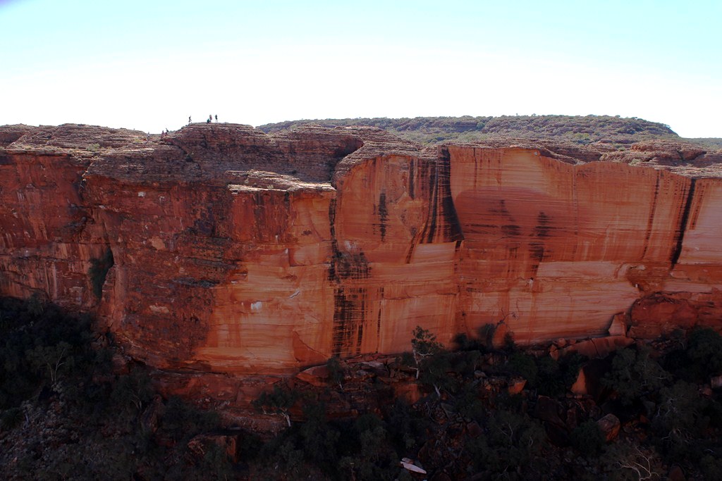 Wir brauchen einige Zeit, um diese exorbitanten Maßstäbe aufzunehmen und verwirklichen zu können. Hier hat Mutter Natur ein wahrhaft grandioses Werk geschaffen. Felsen von solcher Dimension, Farbe und Form – ich bin hin und weg. Und würde sogar glatt sagen, dass der Kings Canyon für mich noch imposanter war als Uluru oder Kata Tjuta.